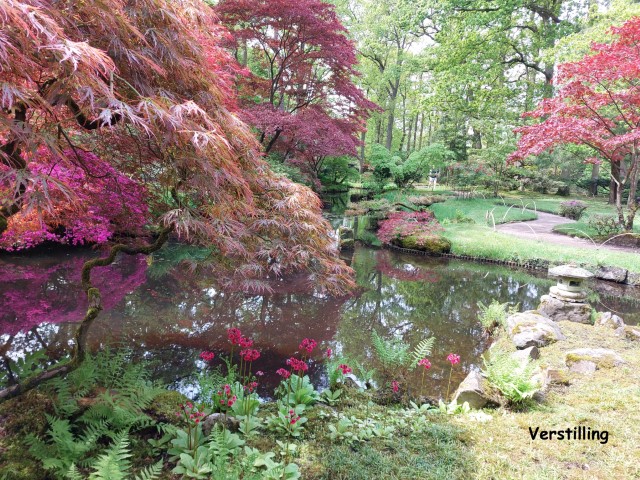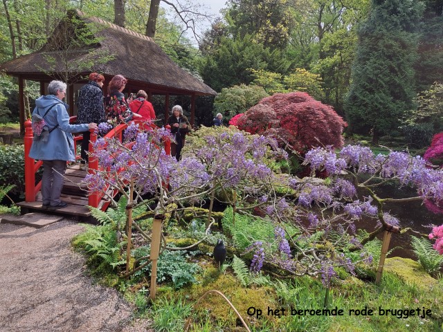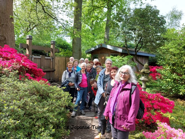 De gids heeft ons meegenomen langs de geschiedenis van het park en we hebben stilgestaan bij de slingermuur met fruitbomen, de Hollandse tuin die meer op een Franse tuin lijkt en bij de veteraanboom, een linde die al bijna 300 jarig oud is. In de wachtrij bij de Japanse tuin heeft de gids nog veel achtergrondinformatie daarover gegeven. Het was de moeite waard! De vele verschillende soorten mos die de bodem bedekken zorgen voor een heel bijzondere sfeer in de tuin. Het is heel kwetsbaar: je mag er niet op lopen en de tuinman haalt met een pincet andere plantjes er voorzichtig tussenuit. Er staan allerlei bijzonder gevormde en mooie gekleurde bomen en struiken. Door het kenmerkende Japanse rode bruggetje en de symbolische beelden kwamen we echt in de Japanse sfeer. Na de gids te hebben bedankt met Goudse stroopwafels gingen we tevreden naar huis.
