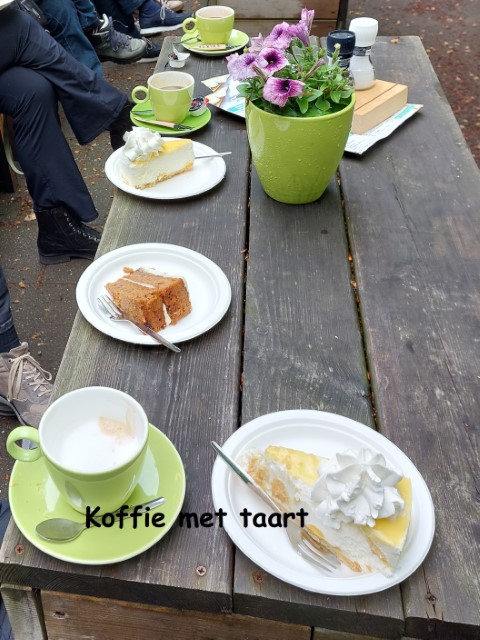 We werden door eigenaren Harm Jan en Jos vriendelijk verwelkomd met koffie/thee en zelfgebakken appeltaart. Er stond een prachtig gedekte lange tafel, in de schaduw onder de bomen, op ons te wachten.