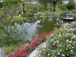 De reis werd vervolgd naar ‘Parkhof Swalmen’ in Swalmen. De olijke eigenaar Jos verwelkomde ons al in de bus en het gezelschap werd, terwijl de regen kletterde op het dak van een heus museum ‘van het rijke roomse leven’, getrakteerd op koffie/thee met overheerlijke Limburgse vlaai. Daarna werd de indrukwekkende tuin met diverse bruggetjes, ‘gekkigheidjes’ en heuveltjes bewonderd en was het af en toe letterlijk ‘pootje baden’. Jammer van de stortbuien want deze tuin verdient meer aandacht dan we nu konden geven.